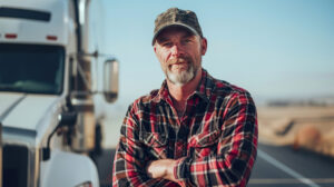 Confident Truck Driver in Plaid Shirt and Cap Standing Beside Semi Truck on Open Road.